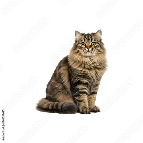 Obraz premium Fluffy brown tabby cat sitting upright with relaxed posture, white background