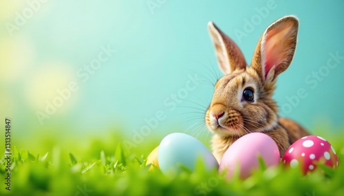 Fototapeta premium Fluffy bunny ears peek from colorful Easter eggs nestled in spring grass ,...