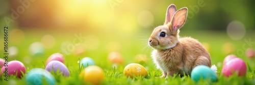 Fototapeta premium Fluffy bunny surrounded by colorful Easter eggs in a vibrant meadow ,...
