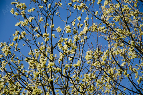 Fototapeta premium Fluffy catkins at at tree against blue sky