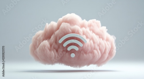 © Narongsag, Obraz premium Fluffy Cloud Wifi Symbol Pastel Pink 3D Render Wireless Network Concept