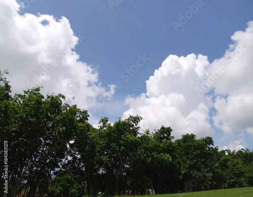 © iya, Obraz premium Fluffy clouds over lush green trees