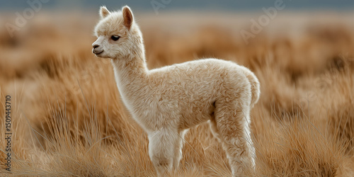 Fototapeta premium Fluffy cream-colored baby alpaca in golden grassland, facing sideways with peaceful posture