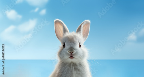 Obraz premium Fluffy cute white Easter bunny looking at the camera on blue sky and sea...