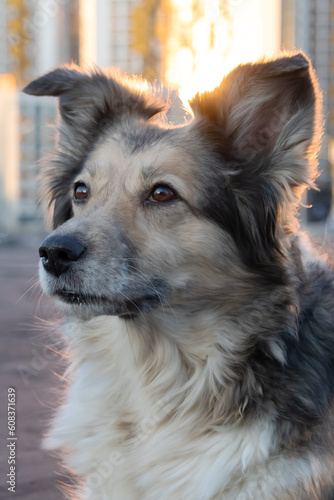 © Vera Aksionava, Fototapeta premium Fluffy dog sitting against backdrop of modern tall buildings