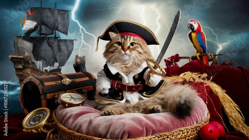 Obraz premium fluffy eye patch pirate costume tabby cat mini sword cute animal pet portrait...