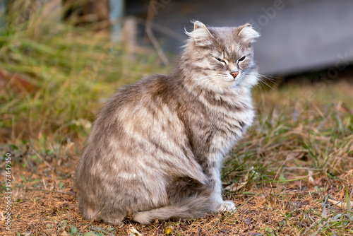 Obraz premium Fluffy gray cat sits on autumn grass.