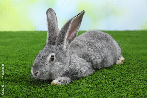 Fototapeta premium Fluffy grey rabbit on green grass outdoors
