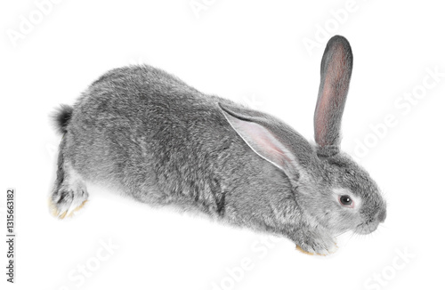 Fototapeta premium Fluffy grey rabbit on white background. Cute pet
