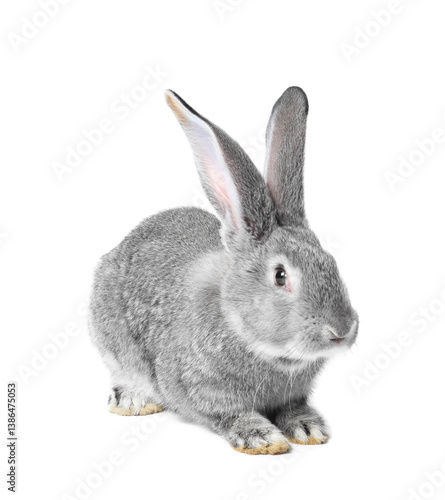 Fototapeta premium Fluffy grey rabbit on white background. Cute pet