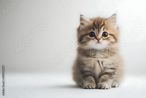 Fototapeta premium Fluffy kitten, small and cute, sitting on white background, full-body shot, high resolution.