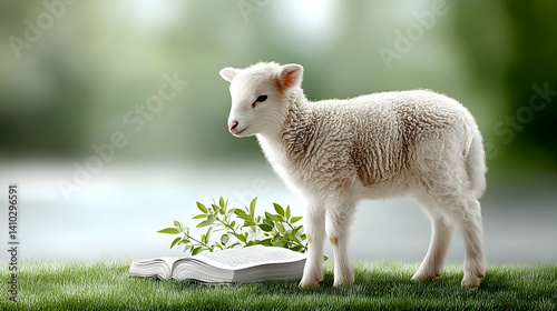 Obraz premium Fluffy lamb beside an open book and greenery on grass