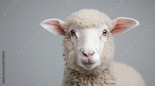 © BROPRADANA, Fototapeta premium Fluffy lamb portrait, studio shot, grey background, farm animal