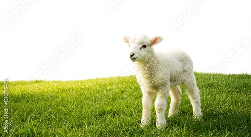 Obraz premium Fluffy lamb stands gracefully in bright sunlight a vibrant green pasture. AI...