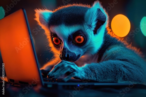 © smalltinykid, Obraz premium fluffy lemur resting on a laptop keyboard amid warm orange and cool teal bokeh lights, curious and cozy nighttime mood