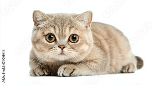 © Space Priest, Obraz premium Fluffy light-colored cat with large eyes lounging on a white background