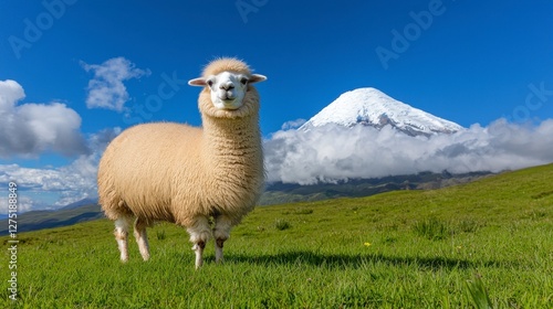 © Noina, Fototapeta premium Fluffy Llama Against Snow Capped Mountain