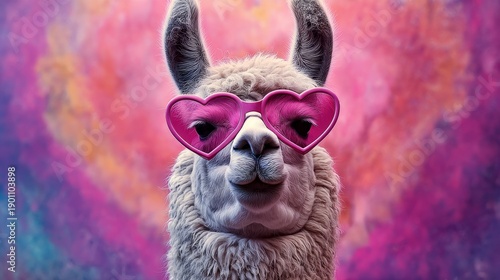 Fototapeta premium Fluffy llama wearing pink heart-shaped sunglasses loving life, copy space
