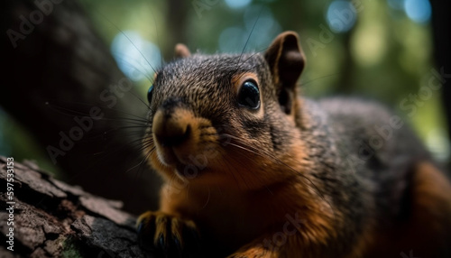 Fototapeta premium Fluffy mammal sitting on tree, looking alert generated by AI