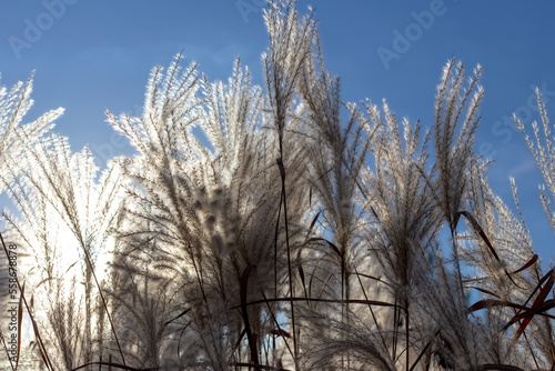 © Надія Сенько, Fototapeta premium Fluffy Mikantus in the wind against the sun against the blue sky
