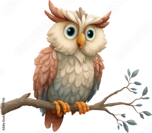Fototapeta premium Fluffy owl sits perched, looking sweetly curious and adorable