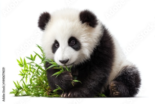 Naklejka premium Fluffy panda enjoying bamboo surrounded by greenery in an isolated setting