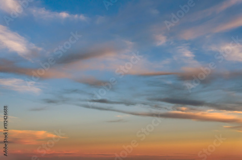 © Viktor Birkus, Obraz premium Fluffy pink orange long cirrus clouds in the evening blue sky