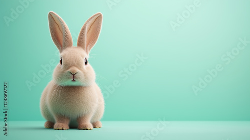 © NaphakStudio, Obraz premium Fluffy rabbit sitting on mint green background, exuding cuteness and charm.