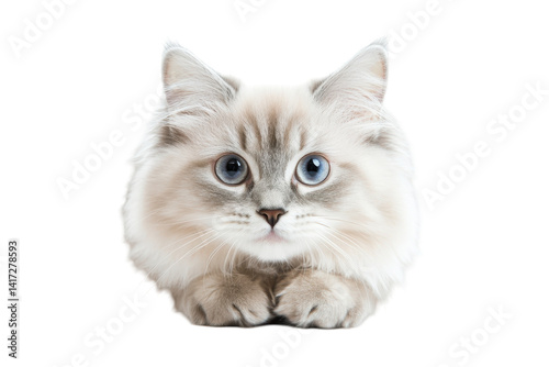 Obraz premium Fluffy Ragdoll cat looking sweetly isolated on white background for cozy home decor graphics