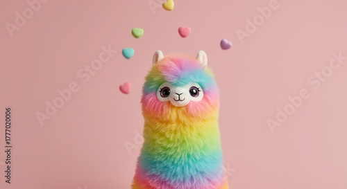 © Ariestia, Naklejka premium Fluffy rainbow colored plush animal stands against a soft pink background with falling heart shapes