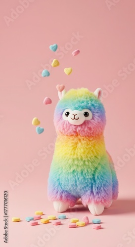 Obraz premium Fluffy rainbow colored plush toy stands surrounded by falling and scattered heart shaped candies