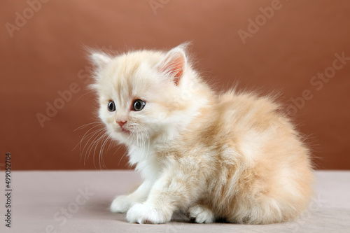 © Сергей Васильченко, Fototapeta premium Fluffy red kitten on a brown background.