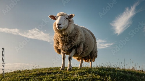© Dido, Fototapeta premium Fluffy Sheep on Hill,Sunset Sky