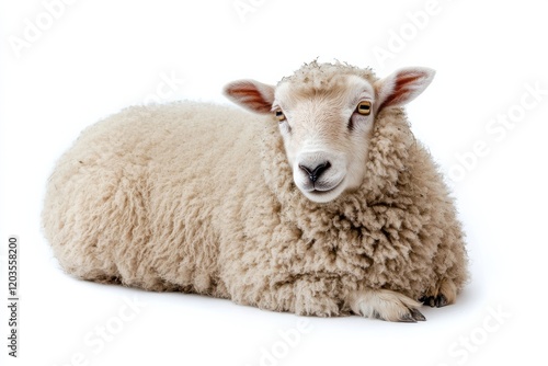 © Zahra, Fototapeta premium Fluffy sheep resting on white background
