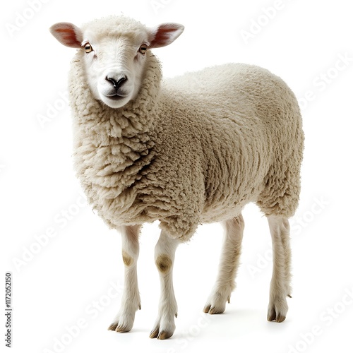 Fototapeta premium Fluffy sheep standing, white background, farm animal. (1)