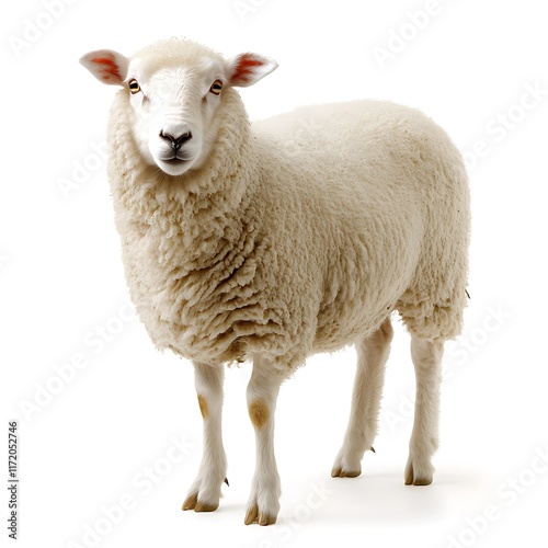 © ardanz, Fototapeta premium Fluffy sheep standing, white background, farm animal. (2)