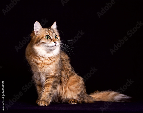 © annatronova, Obraz premium Fluffy siberian cat sitting on black background