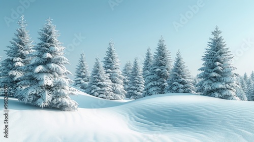 Naklejka premium Fluffy spruce trees blanketed in snow atop white humps under a bright clear...