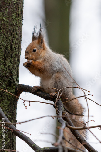 Fototapeta premium Fluffy squirrel sits on a tree and eats a nut