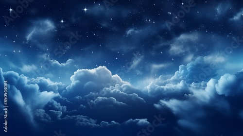 Obraz premium Fluffy volumetric clouds at night against a dark blue sky with stars background.