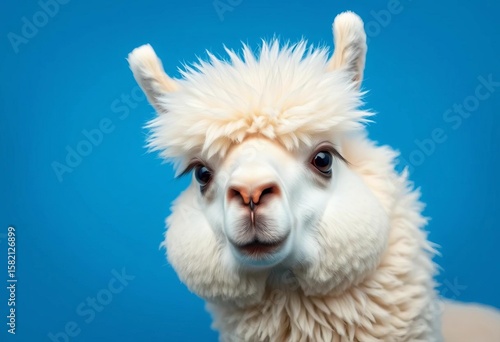 © Chavankorn, Fototapeta premium Fluffy white alpaca with comical expression against vibrant blue background, comic, blue