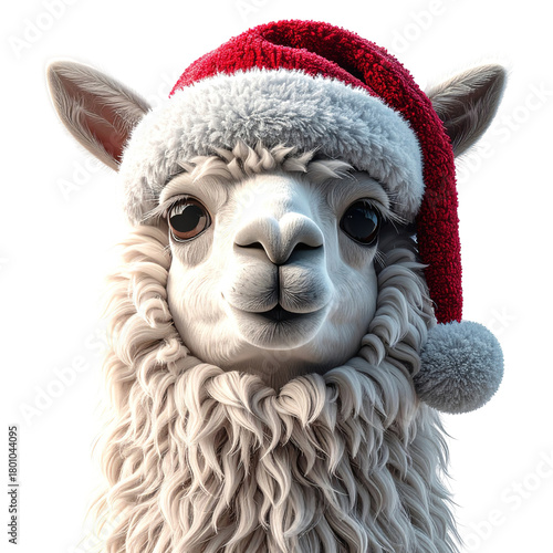 © Mori Deci, Obraz premium Fluffy white animal portrait wearing a festive red and white winter hat, clipart, isolated on a transparent background.