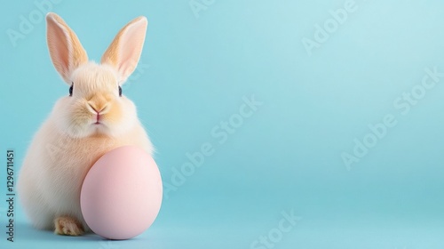 © loongnuad, Fototapeta premium Fluffy White Bunny Holding Pink Easter Egg on Light Blue Background