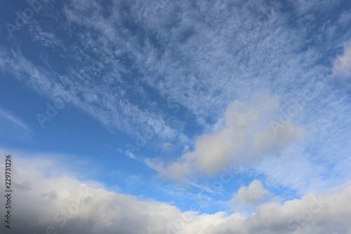 © mcKensa, Obraz premium Fluffy white clouds against blue sky