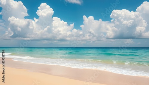 Fototapeta premium Fluffy white clouds drift over a pristine, golden sand beach, light, scenic