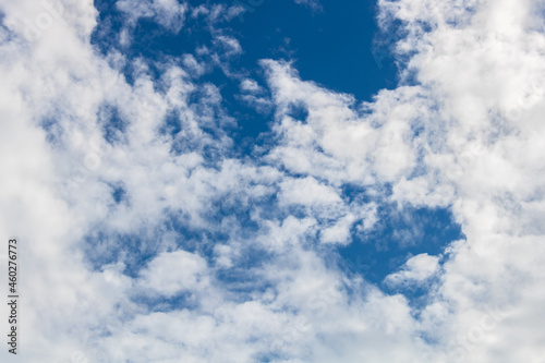 © Marta Nogueira, Obraz premium Fluffy white clouds framing the picture in the vibrant blue sky. View from below