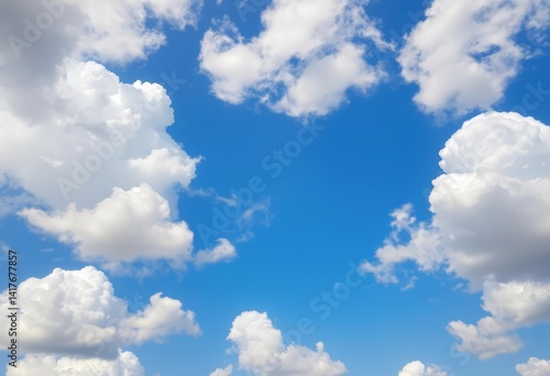 Obraz premium Fluffy white cumulus clouds dominate a vibrant blue sky, ideal for serene...