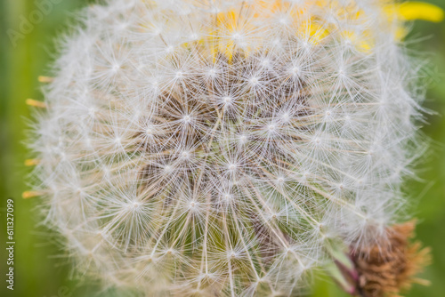 © decorator, Fototapeta premium Fluffy white dandelion close-up on green background. Macro shot.. Dandelion seeds close-up abstract natural background