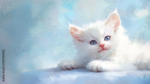© BanklangArtshop, Fototapeta premium Fluffy white kitten resting on soft background.