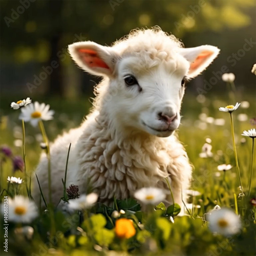 © Aasma, Fototapeta premium fluffy white lamb resting in a spring meadow filled with yellow dandelions, qurbani sheep field,
